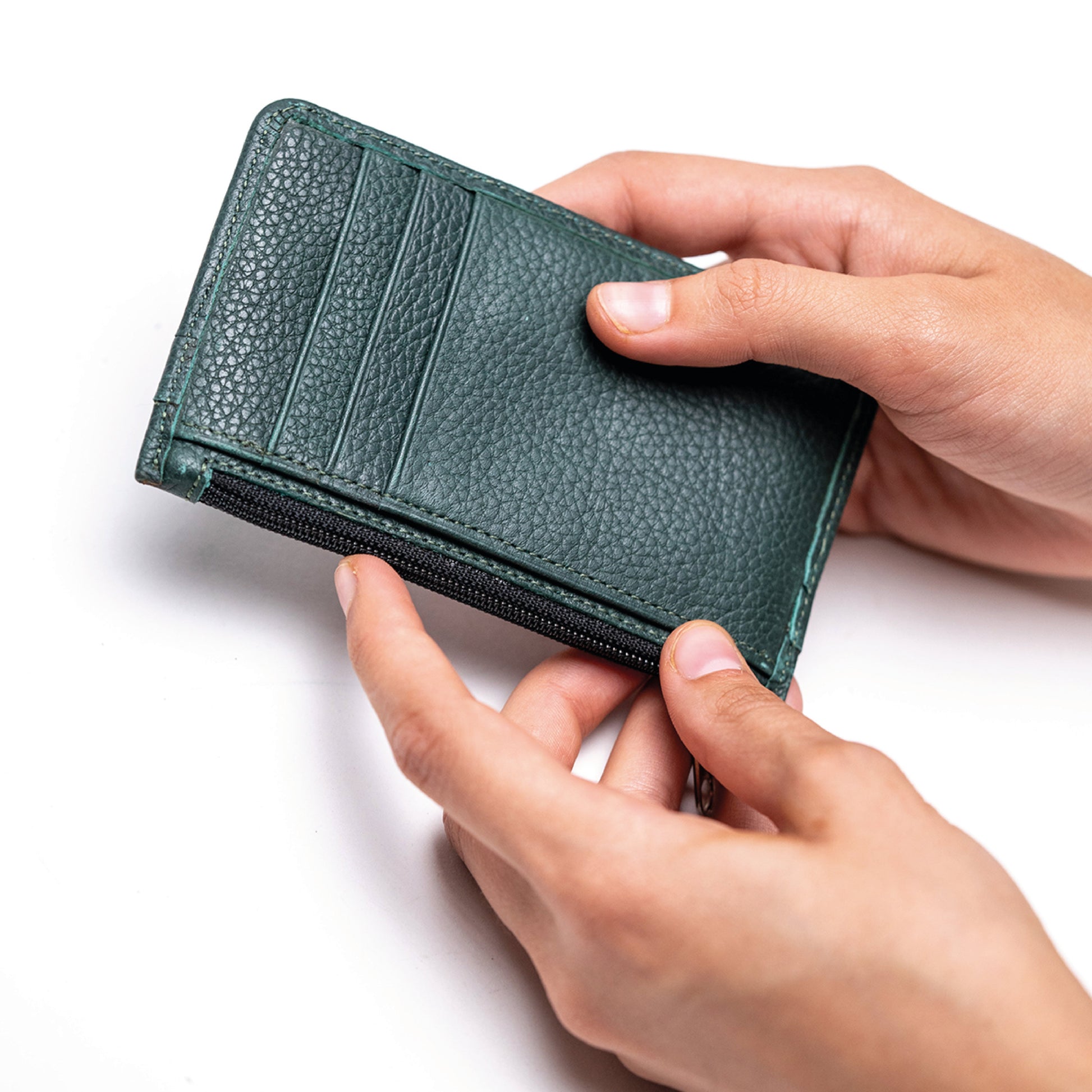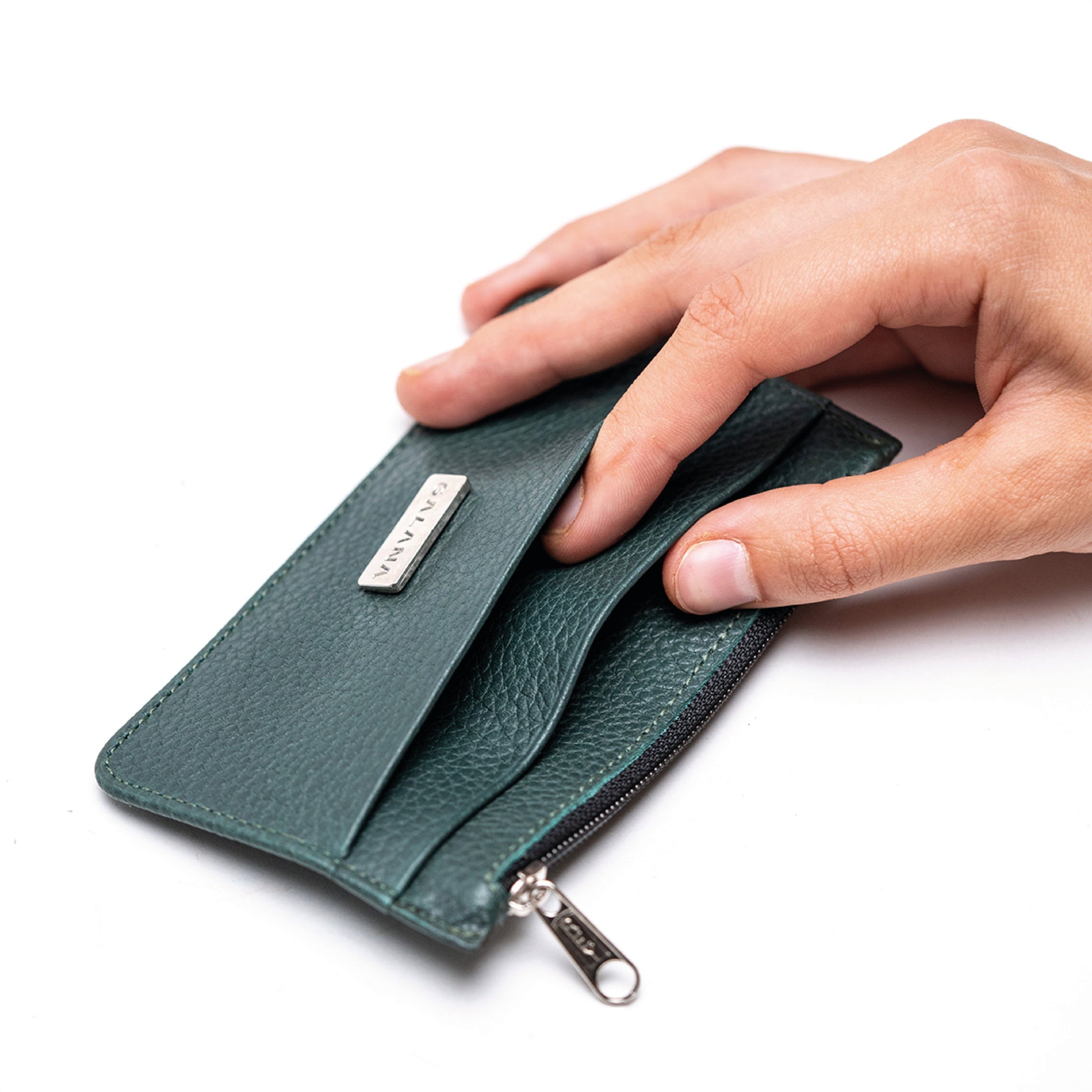 • Interior sin forro, mostrando la textura natural del cuero.