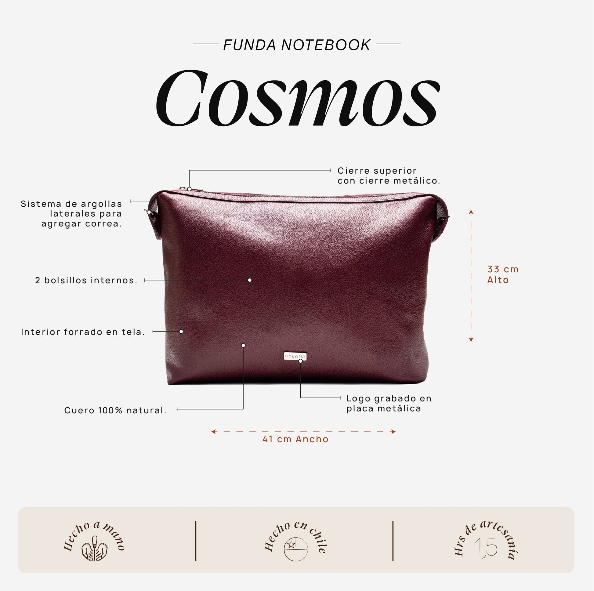 • Material: Cuero de vacuno 100% natural.