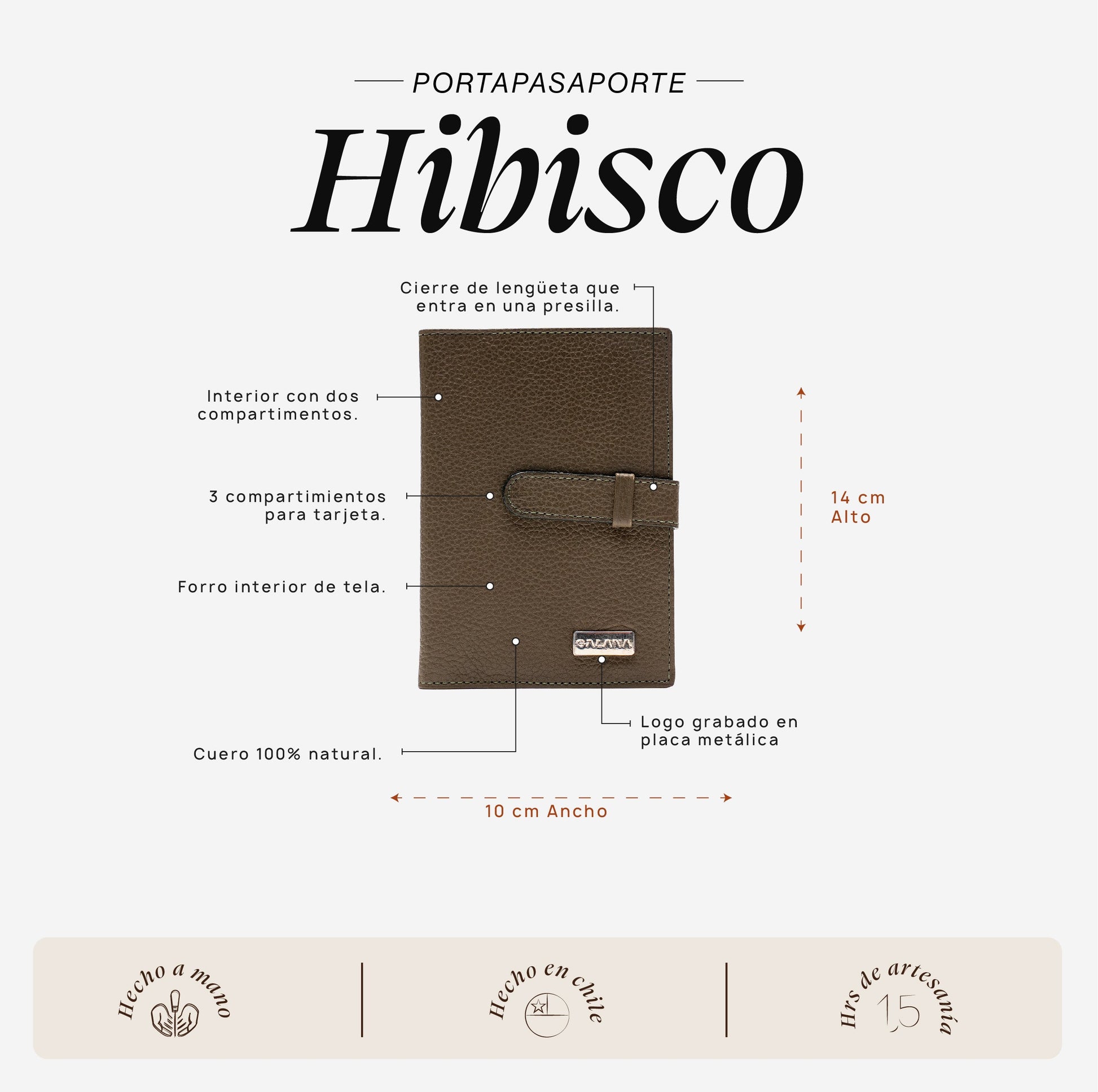 • Interior con dos compartimentos principales: uno para el pasaporte y otro para documentos o papeles de viaje.